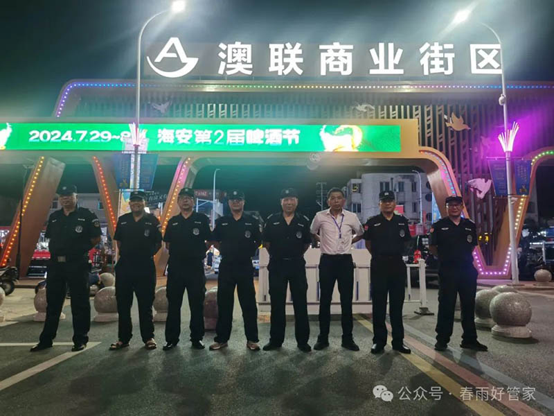 在盛夏的阳光下,海安第二届啤酒节于7月29日在开发区洋蛮河办事处澳联商业街区隆重开幕。作为这一盛会的安保合作伙伴,南通春雨保安服务公司肩负着维护活动秩序、保障参与者安全的重要使命。 领导出席,保安全程 开幕式上,海安市委常委、开发区党工委副书记张永华和海安市委常委、宣传部部长顾黎峰等领导亲临现场,为啤酒节揭开神秘的面纱。南通春雨保安公司全体安保人员严阵以待,确保活动现场安全有序。 严密巡逻,维护秩序 南通春雨保安公司的安保团队在活动期间全面展开巡逻,密切关注人流、车流,防范各类安全风险。他们配备先进的通讯设备,紧密协作,确保活动现场的平安与和谐。
