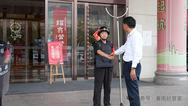临近中午,雨渐渐停了,天空转为阴天。酒店内外,秩序井然。考生们或在房间里做最后的温习,或在家人的陪伴下稍作休息。而春雨的保安们,依旧在自己的岗位上,用他们的专注与坚守,默默守护着这些即将在考场上“听惊雷”的学子们。这份润物无声的守护,是春雨集团为海安高考学子们送上的最好答卷。