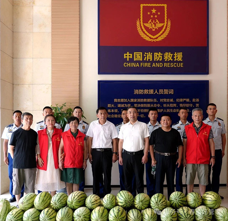 春雨集团的代表们满载着情意,为消防营地送去了800多斤清甜可口的大西瓜并表示:在炎热的夏季,消防官兵们依然要身着厚重的战斗服进行高强度的训练和执勤,希望这些西瓜能为大家送去一份清凉,带去一份集团全体员工的真挚感谢。与此同时,海安110志愿服务队的队员们也为官兵们带来了精心准备的文艺节目。欢快的歌声、热情的舞蹈,为平日里纪律严明、略显严肃的营区增添了许多欢声笑语。